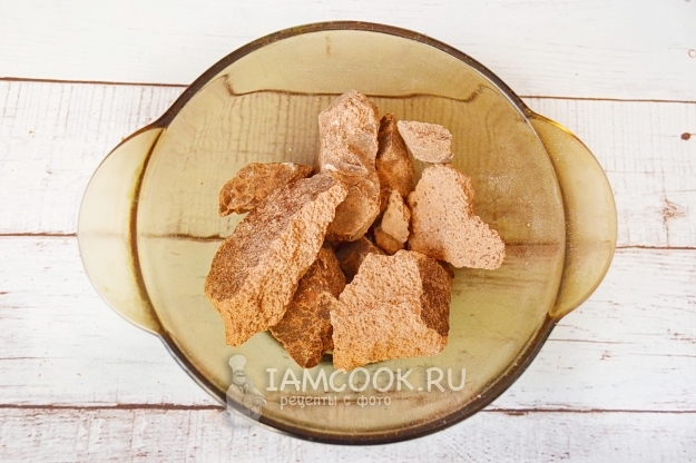Подготовим продукты. Тёртое какао представляет собой довольно твердую субстанцию. Для использования нам может понадобиться даже разбивать монолит молоточком. А измельчить тертое какао нужно, потому что иначе оно будет долго плавиться. Какао масло ломается легко, это нежный и деликатный продукт.
