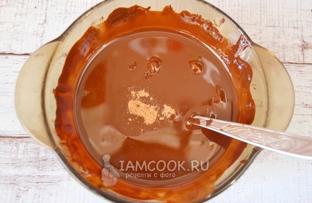 Теперь нам нужно будет еще совсем немного подогреть массу, буквально несколько минут. Температуру нам нужно будет довести до 32 градусов. Все это время перемешиваем шоколадную массу.