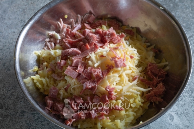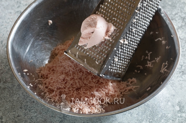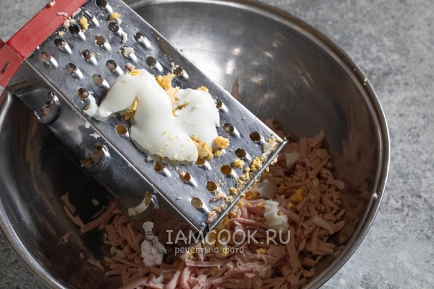 Трем на крупной терке 350 граммов вареной колбасы. Не всю колбасу, а примерно половину, но, так сказать, большую половину, а не меньшую.