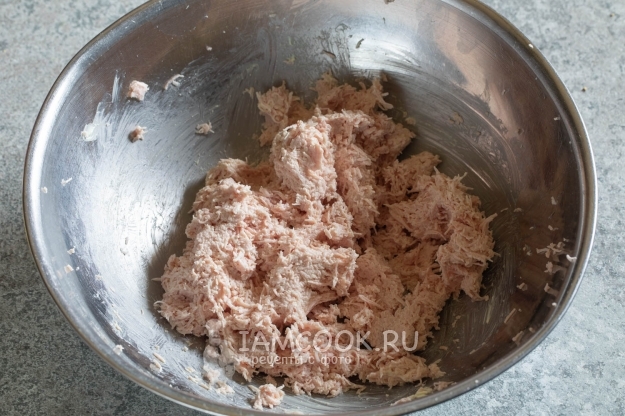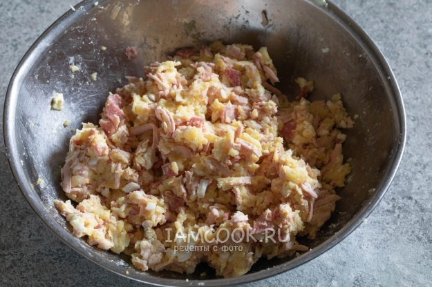 Очень тщательно смешиваем тертую колбасу с остатком майонеза, чтобы возникла достаточно гомогенная и пластичная масса.