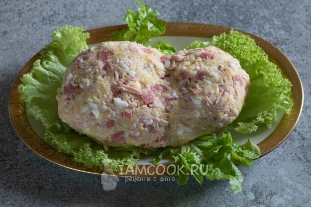 Как следует умяв салат в плотную массу, формируем из этой смеси что-то вроде батона, выкладываем его на то блюдо, на котором салат будет сервироваться. Намечаем шею.