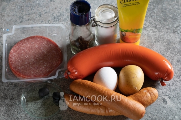 Почему я вообще завожу речь в рецепте одного салата о другом? А для того, чтобы вы не попытались сделать оливье по первому рецепту в виде объемной свиньи, как во втором рецепте. Из-за наличия огурцов и сметаны, которые дают жидкость, оливье форму держать не будет. Чтобы свинья не поползла и не расплылась, ее нужно делать из другого набора ингредиентов, менее влажных. По этой же причине нежелательна и замена майонеза на сметану. В общем, салат Свинья из колбасы - очень калорийный.
