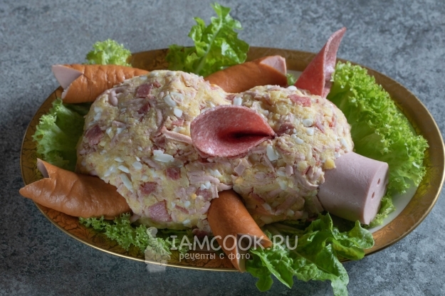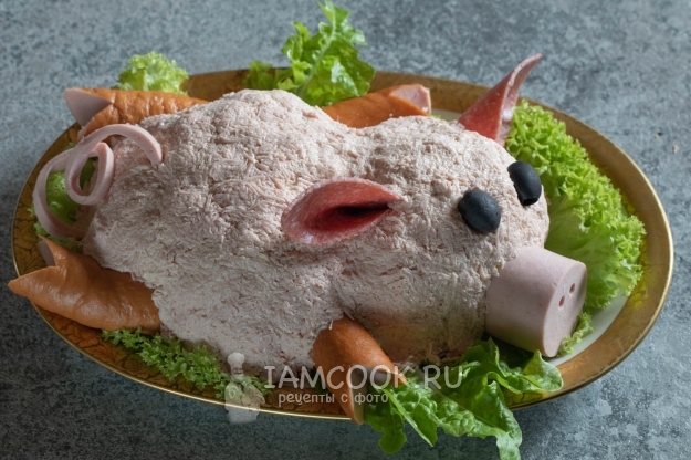 Из двух тонких кусков салями или сервелата вырезать уши, из одной шайбочки вареной колбасы или сардельки толщиной около 5 мм - спираль для хвоста. Из тонкой колбасы или сардельки - рыло длиной около 5 см (если колбаса достаточно мягкая, то в ней можно проколоть ноздри коктейльной дырочкой). Для ног сардельки разрезаются надвое, и на кончиках вырезаются раздвоенные копыта. Все обрезки колбасы от деталей декора пойдут в салат.