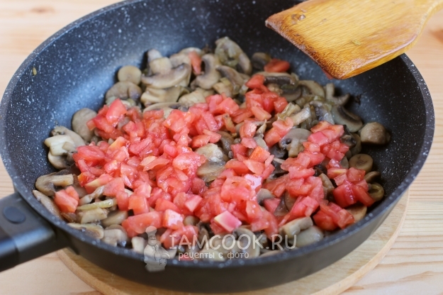 К обжаренным грибам добавляем нарезанную мякоть помидоров, и на этом этапе можно добавить соль, перец и сахар. Сахар нужен для того, чтобы не было кислинки от помидоров.