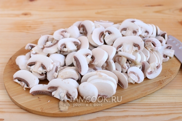 Грибы почистим, мыть их не нужно, а затем нарежем пластинами.