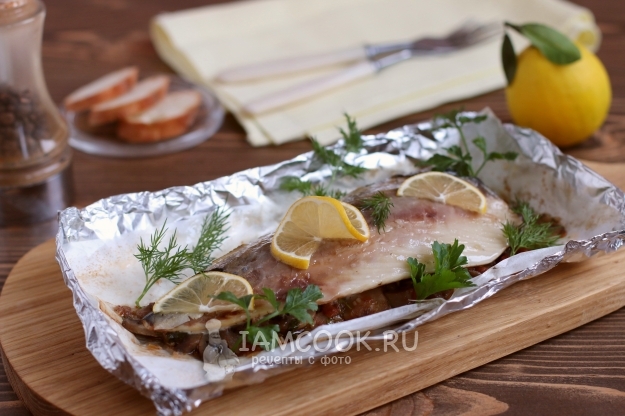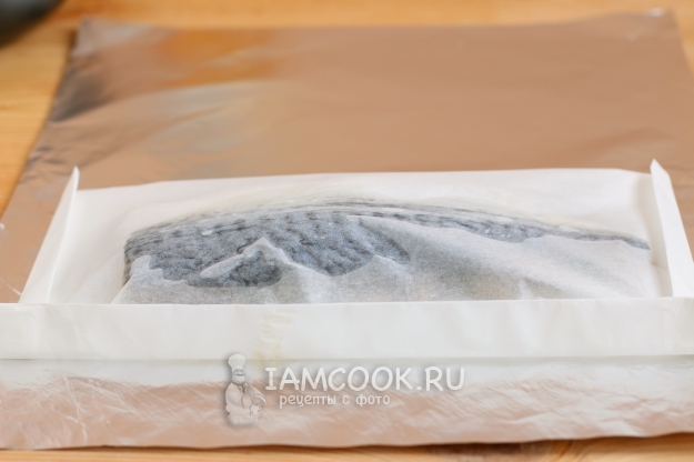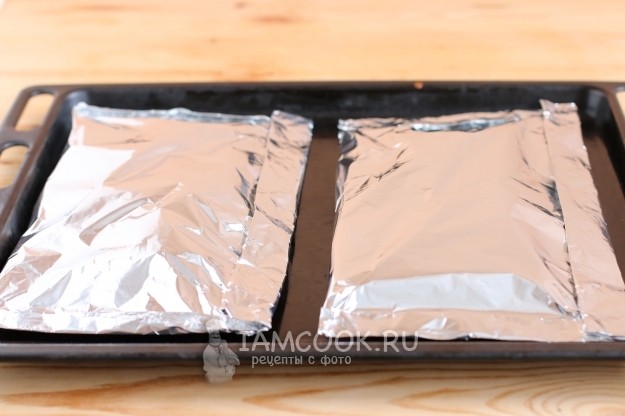 Теперь таким же образом закрываем конверт из пергамента конвертом из фольги. Это на всякий случай, чтобы не вытекала начинка. Проделаем все то же самое со вторым филе и начинкой. Расположим 2 этих конверта на противне и отправим в разогретую духовку.