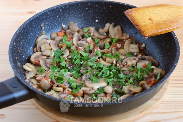 Через минуту добавляем в сковороду порезанные петрушку и чеснок, перемешиваем и через минуту выключаем. Начинка готова.