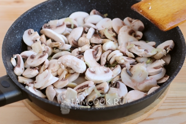 К обжаренному луку добавим грибы и продолжим обжаривать их вместе, помешивая лопаткой.