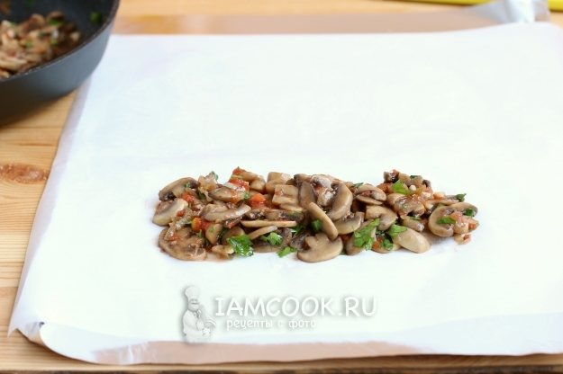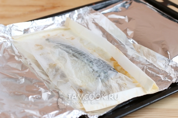 Отрежем равные по размеру прямоугольники из фольги и пергамента, разложим их друг на друге на столе, чтобы пергамент был сверху. Поделим мысленно прямоугольник пополам и в середине нижней его части разложим половину начинки в форме филе скумбрии.