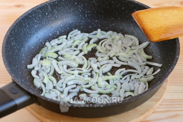 Обжарим на растительном масле лук. А пока обжаривается лук, включим духовку и разогреем ее до 180 градусов.