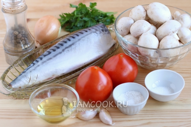 Итак, возьмем необходимые продукты, из которых приготовим 2 порции скумбрии, запеченной с грибами в конверте.