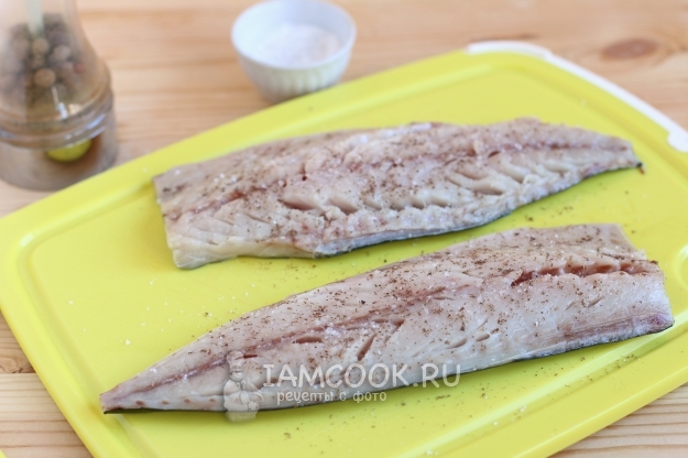 Если у вас скумбрия замороженная, как у меня, то дадим ей время разморозиться, а после разрежем ее вдоль на 2 филе, хребет удалим. Каждое филе посолим, поперчим и пока отставим, чтобы подготовить подушку из овощей, на которой будет запекаться наша рыбка.