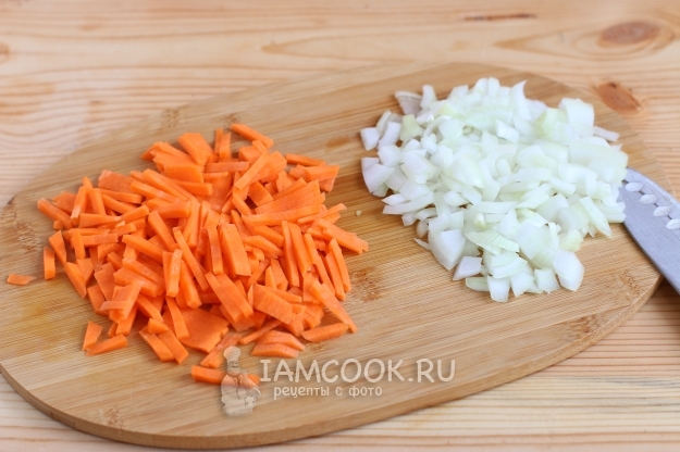 Нарежем мелко вторую половину луковицы и морковь тонкими брусочками.