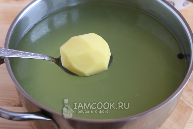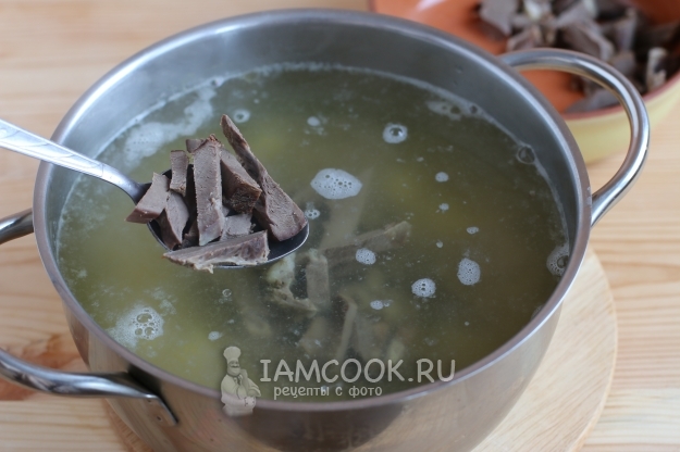 Когда сердце сварится, уберем его из кастрюли и остудим, а в бульон положим одну очищенную картофелину и будем варить.