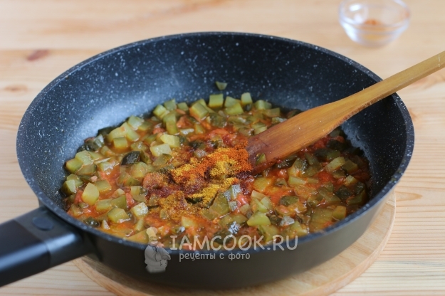 Обжарим в той же сковороде после лука и моркови порезанные огурцы, добавляем специи, натертый помидор.