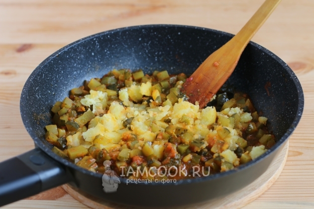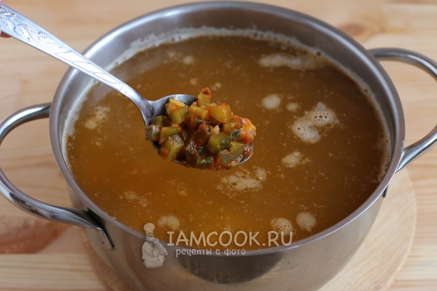 Следом отправляем в суп зажарку из соленых огурцов с томатом и толченым картофелем.