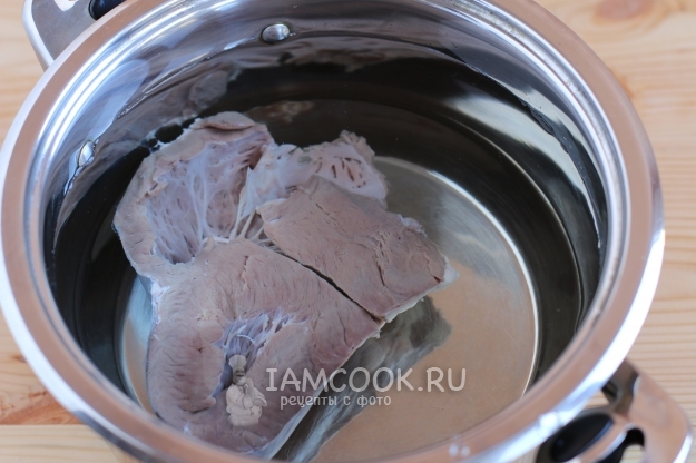 Так как сердце требует предварительной подготовки, то это можно сделать накануне. Перед тем как его варить, срежем с него лишний слой жира, который обычно располагается в верхней части сердца. Затем сердце нужно хорошо помыть и замочить в воде как минимум на полчаса, это нужно для того, чтобы в воду вышла кровь, которая может быть внутри.