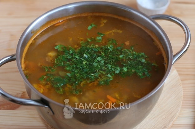 Когда картофель в бульоне сварится, закладываем в бульон отваренную перловку.