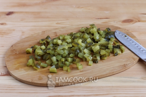 Нарежем мелким кубиком соленые огурцы. Если из них вытекает рассол, не выливаем его, отправим его в суп вместе с зажарками.