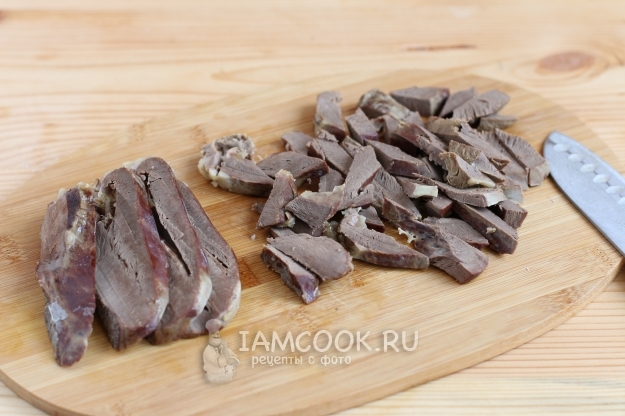 Пока варится картофель, нарежем произвольными кусочками говяжье сердце.