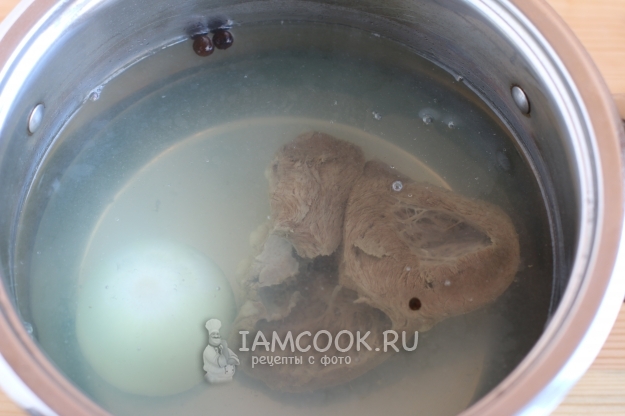 После смены воды, как только бульон закипит, кладем половину луковицы, горошины душистого и черного перца и варим до полной готовности сердца.
