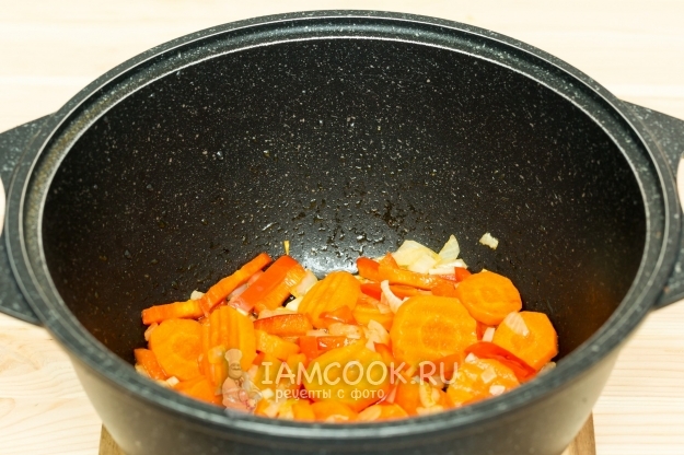 Лук, морковь, чеснок и перец нарежем и обжарим, помешивая, пару минут.