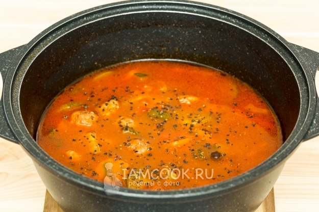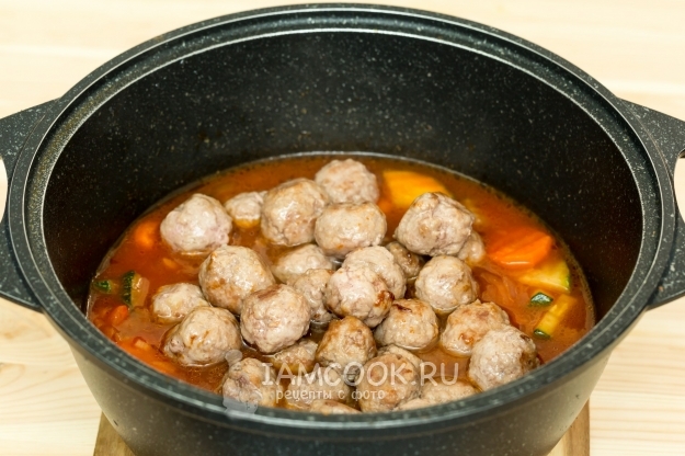 Выкладываем обжаренные фрикадельки в казан с овощами. Добавим душистый перец.