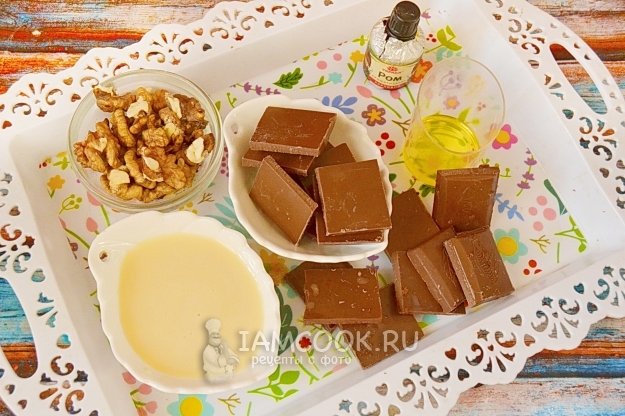 Для ганаша (начинки) нам понадобятся шоколад, орехи, масло грецкого ореха, ароматизатор и сгущенка. Оболочка — из молочного шоколада. Норма шоколада в рецептуре указана больше, чем нужно для производства конфет, так комфортнее с ним работать. Остатки потом можно будет собрать и использовать повторно. Я рекомендую под рукой иметь еще и какао-масло. Если шоколад будет обладать слабой текучестью, то какао-масло исправит положение. В данном случае мне тоже пришлось прибегнуть к какао-маслу, хотя изначально я его не планировала использовать.