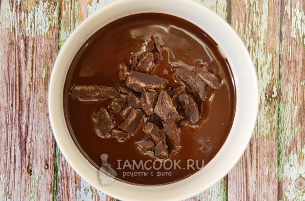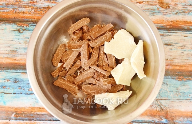 В миску сложим шоколад и какао-масло. Поставим на водяную баню и начнем плавить. Все время, пока шоколад плавится, вымешиваем его.