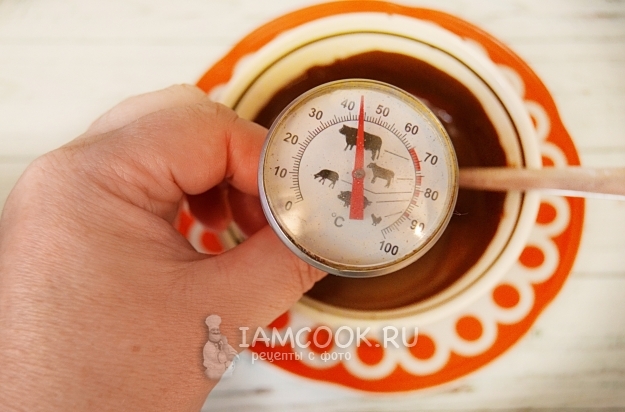 Тщательно вымешиваем, пока новый шоколад не расплавится, а температура массы не упадет до 27 градусов.