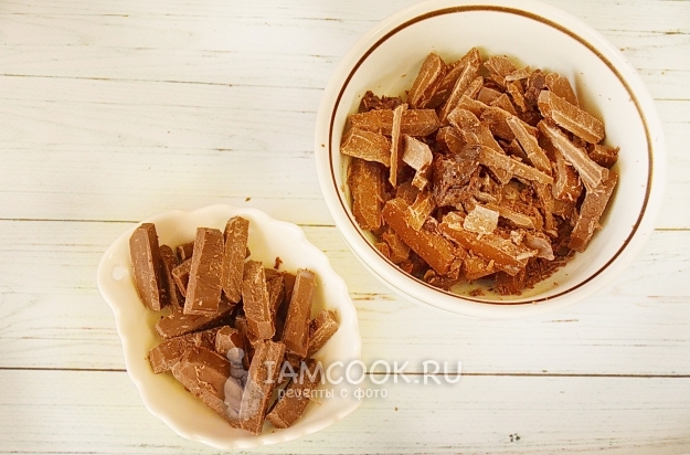 Нарубим шоколад. Четвертую часть его отложим для затравки (формирования кристаллической структуры при темперировании).