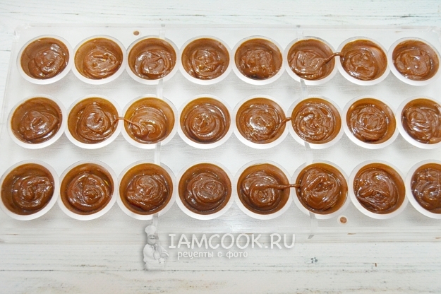 Наполним ячейки формы шоколадом. Обязательно постучим формой об стол раз 20. Эта процедура нужна, чтобы шоколад распределился по ячейке и заполнил воздушные пустоты.