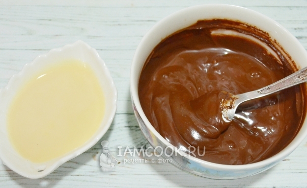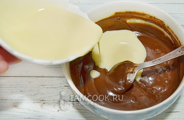 Добавим в шоколад сгущенку. Тщательно перемешаем.