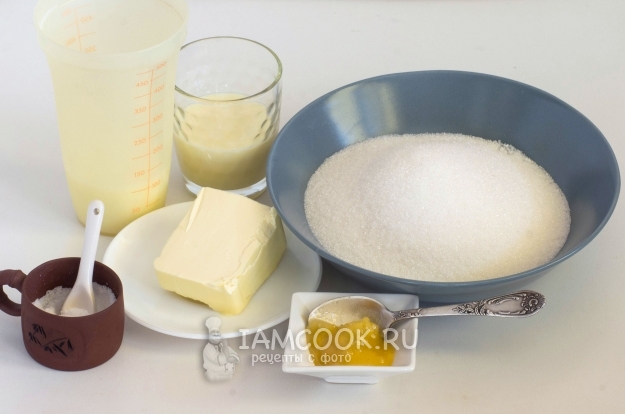 Добавьте сгущенку, соль, мед и сливочное масло.