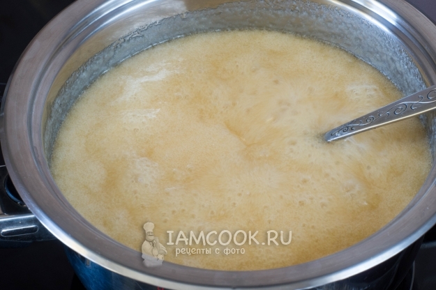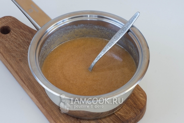 Перемешайте. Начните уваривать до густоты жидкого меда, а также изменения цвета до светло-коричневого.