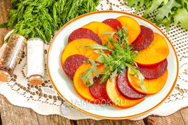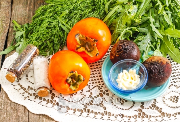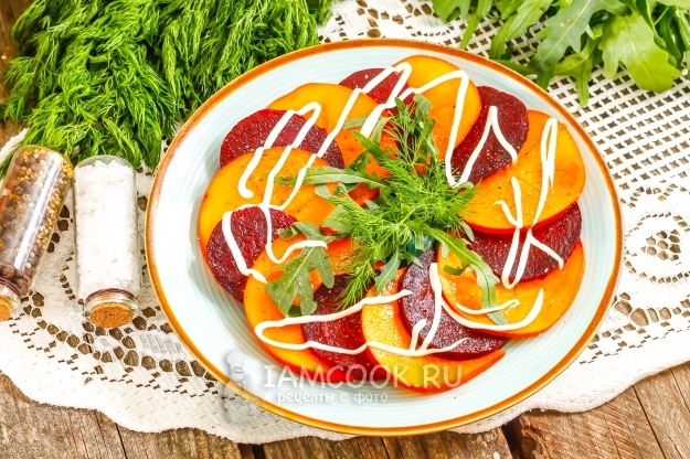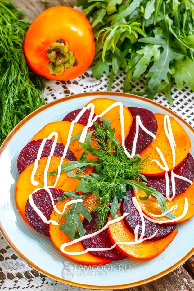 Салат из хурмы и свеклы полностью готов! Подайте его к столу.