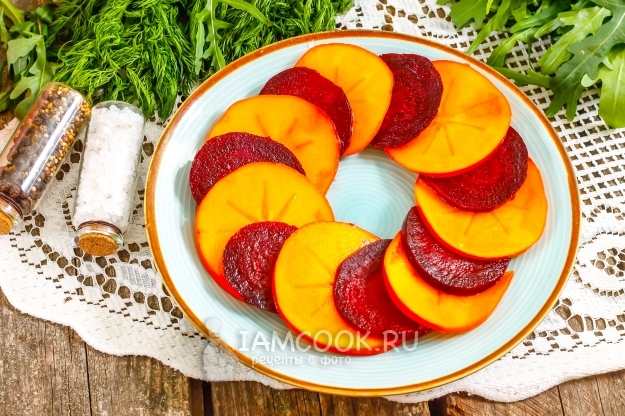 Выложите на тарелку нарезку свеклы и хурмы, одна за одной, в виде венка.