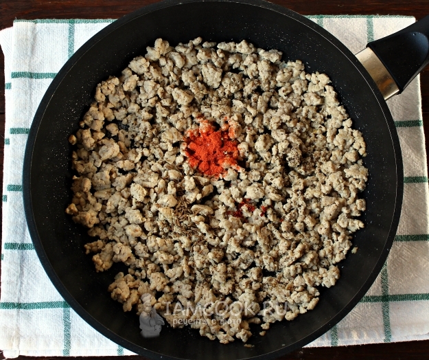 В сковороду наливаем масло и разогреваем его. Добавляем фарш. Жарим, помешивая, пока мясо не поменяет цвет. Затем добавляем приправы: паприку, соль, перец, зиру и измельченные перец чили и зубчик чеснока. Продолжаем готовить еще минут 10, периодически помешивая.