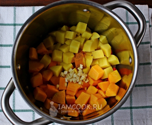 Вливаем в кастрюлю воду (можно бульон), добавляем соль. Доводим содержимое кастрюли до закипания, затем огонь убавляем до минимального. Варим до готовности тыквы и картофеля, примерно минут 20.