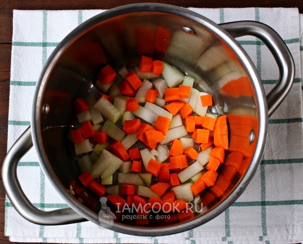 В кастрюлю наливаем масло, разогреваем. Добавляем нарезанные небольшими кубиками морковь и лук, жарим 3-4 минуты, периодически помешивая.