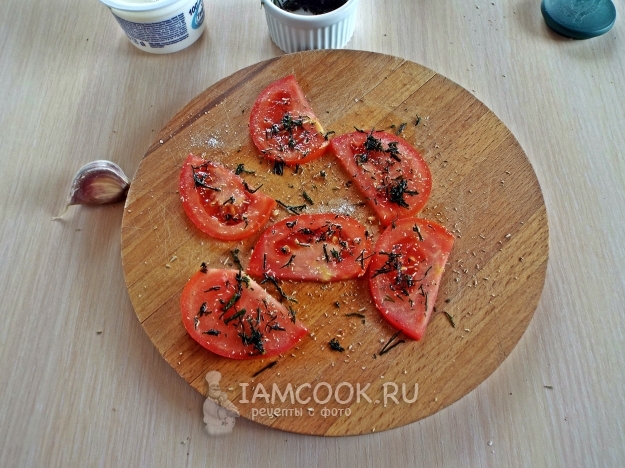 Половину большого помидора нарезать тонкими дольками. Посыпать розмарином и укропом.