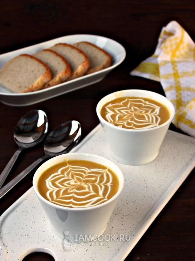 Нежный и ароматный тыквенный крем-суп с печеным яблоком и сливками готов. Подаем суп сразу, разлив его по тарелкам. В каждую тарелку, при желании, можно добавить тыквенные семечки или сухарики. Приятного аппетита!
