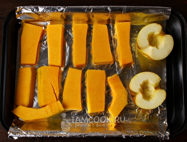 Мякоть тыквы режем дольками толщиной примерно 2 см и выкладываем на противень. Яблоко разрезаем на половинки, удаляем сердцевину. Помещаем на противень, к тыкве, срезом вверх. Противень закрываем фольгой и ставим в заранее разогретый до 190 градусов духовой шкаф. Запекаем до мягкости, примерно 15-25 минут. Время запекания зависит от сорта тыквы и яблок.
