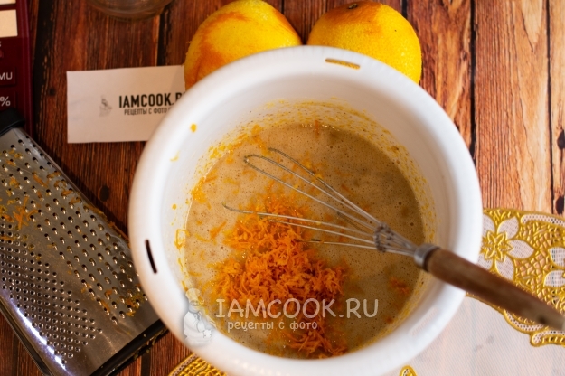 Пришла очередь апельсинов. Их нужно ошпарить кипятком, натереть на мелкой терке оранжевую цедру. Сильно не увлекайтесь. Достаточно пройтись сверху теркой, избегая белой кожицы. Добавьте цедру в тесто и перемешайте.