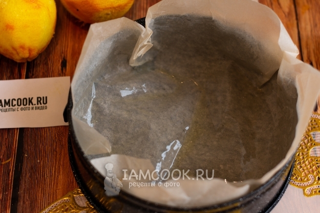 Тесто готово, теперь нужно подготовить емкость для выпечки. У меня была разъемная форма диаметром 23 см. Большой диаметр формы брать не стоит, ведь этот пирог не поднимется. Иначе может получиться большой оладушек)