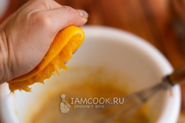 Следующий ингредиент - сок одного апельсина. Его можно выжать руками, только старайтесь вылавливать косточки. Можно выжимать на сито, тогда все косточки останутся в нем, а не в тесте. И все хорошо перемешайте.