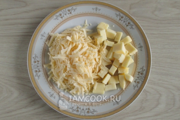 Сыр эмменталер (или другой подходящий) крупно натрите, а сулугуни (моцареллу или подобный) нарежьте кубиком.