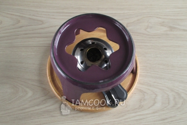 Подготовьте горелку или свечку, соберите конструкцию для фондю: поднос, горелку, подставку и чашу. Кто-то называет фондюшница, кто-то - фондюрница, а так-то это какелон. Зажгите горелку или плоскую свечу.