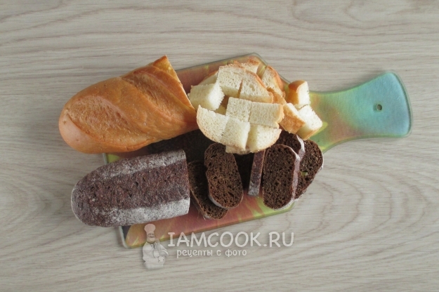 Оба вида хлеба нарежьте на кусочки желаемых формы и размера. Они должны хорошо фиксироваться на палочках-вилках.