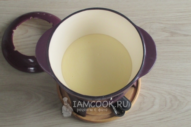 Влейте сырную массу. Если предусмотрена ещё крышка с отверстием и прорезями для вилок, то установите и её.